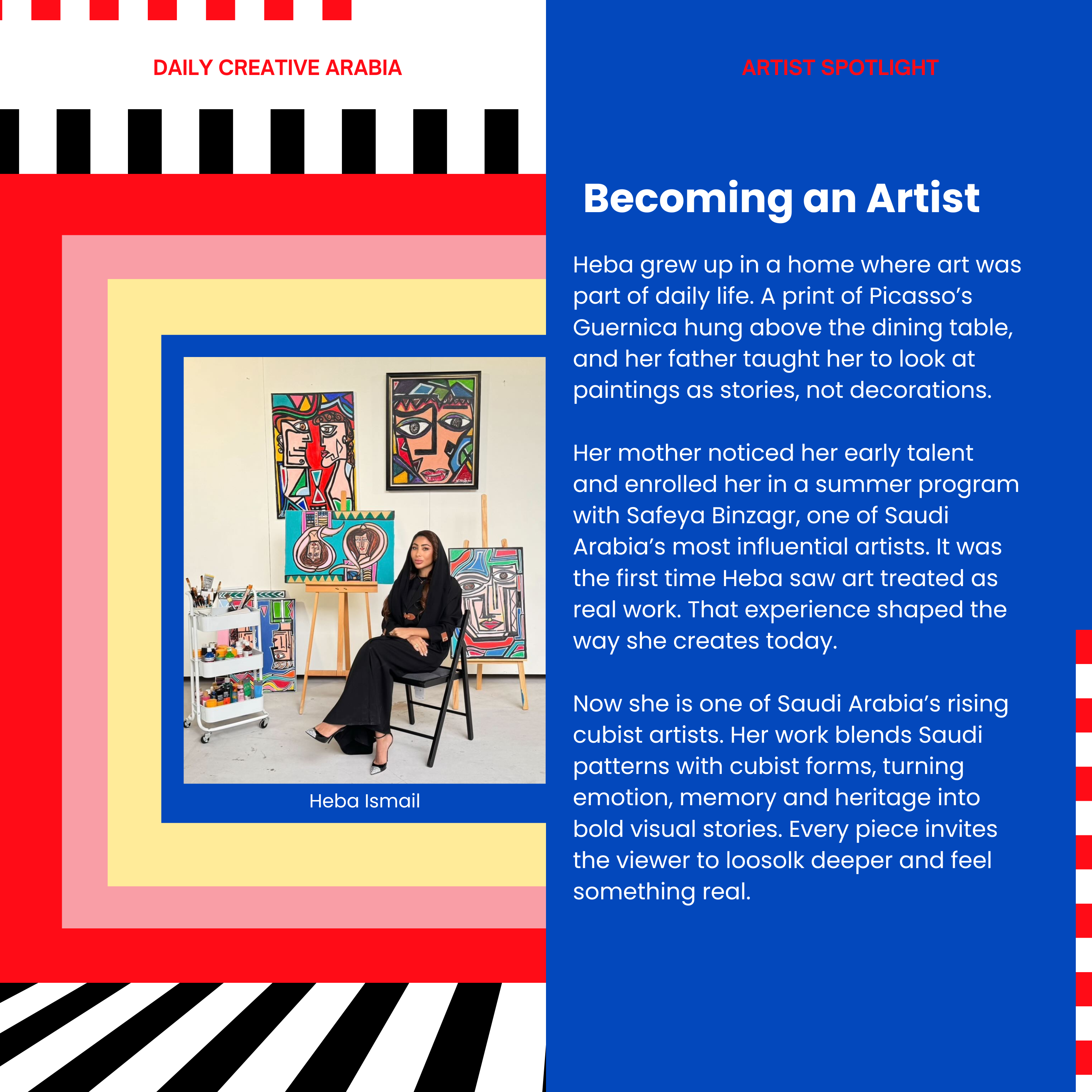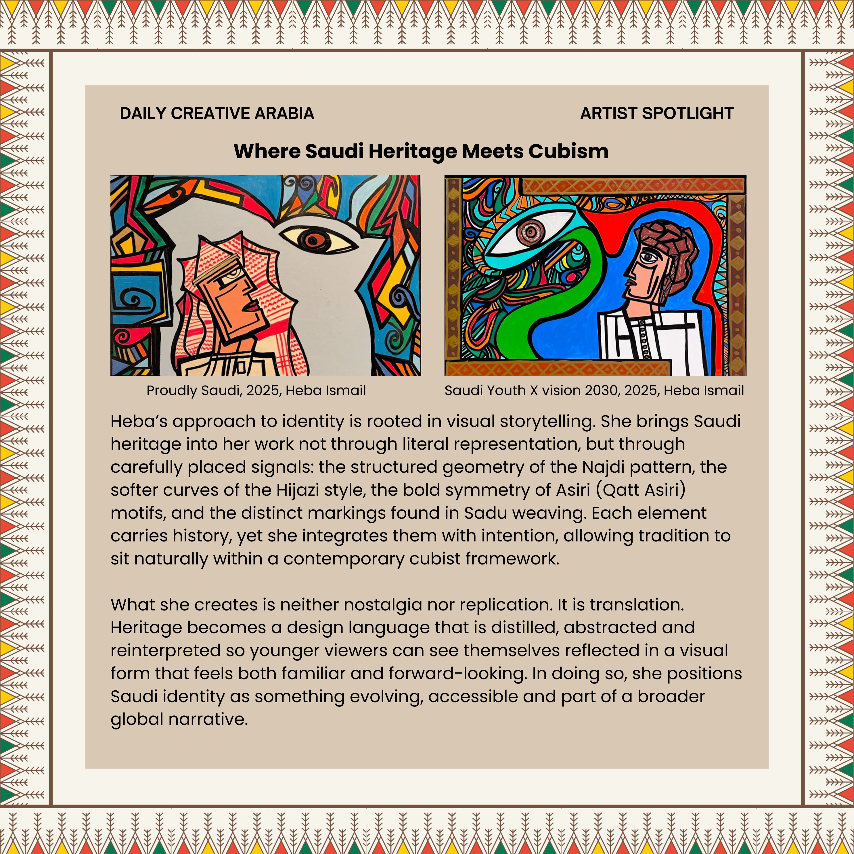 Heba’s work is already reshaping how Saudi stories appear on the canvas. I am excited to see where her vision goes next, and how she will continue weaving Saudi heritage, modern femininity and cubism into her own unmistakable language.