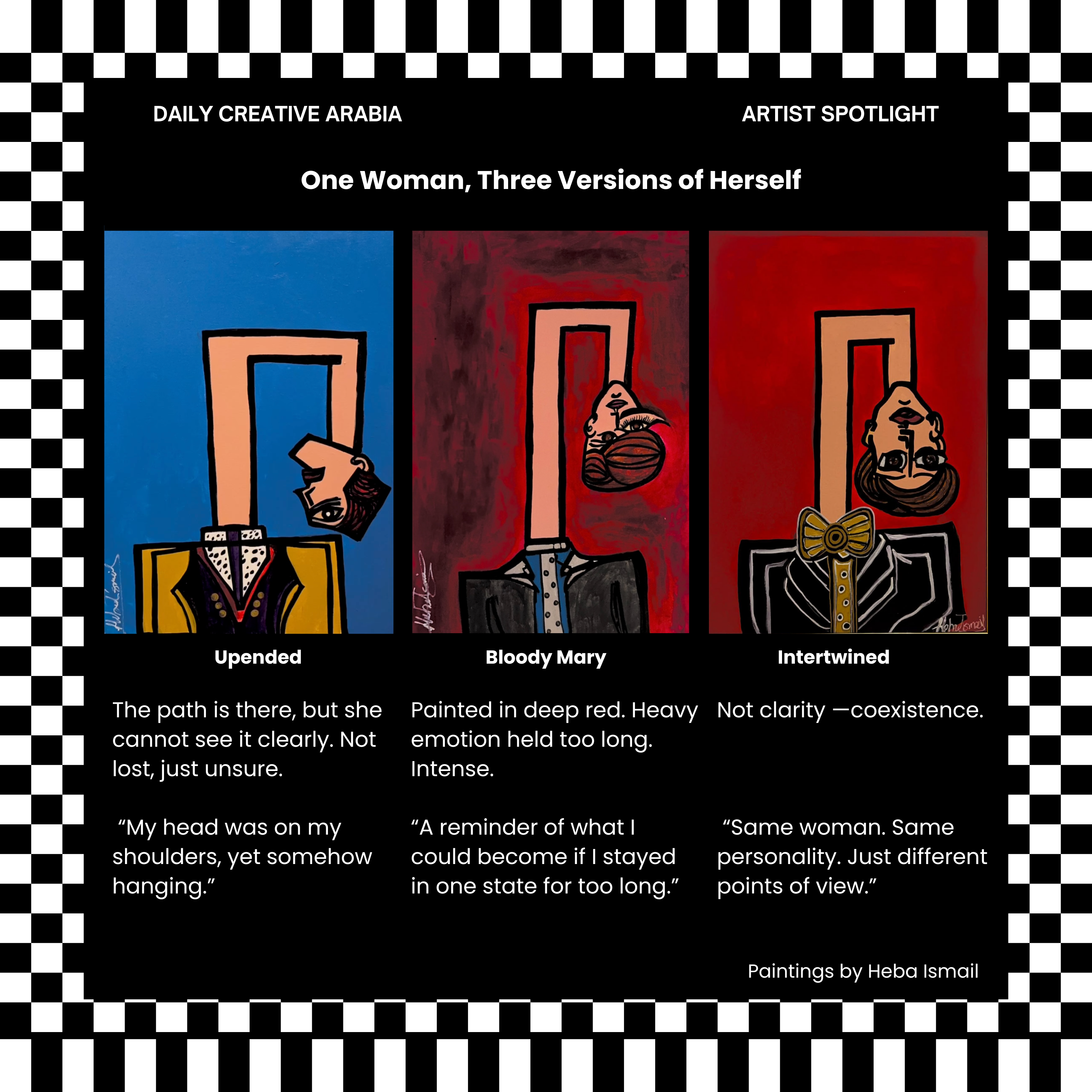 This painting brings the story together. Three heads tilt in different directions, yet belong to the same woman. Heba was exploring how one person can hold many viewpoints at the same time. She explained it simply: they are the same woman with the same personality, but each head reflects a different side of her.