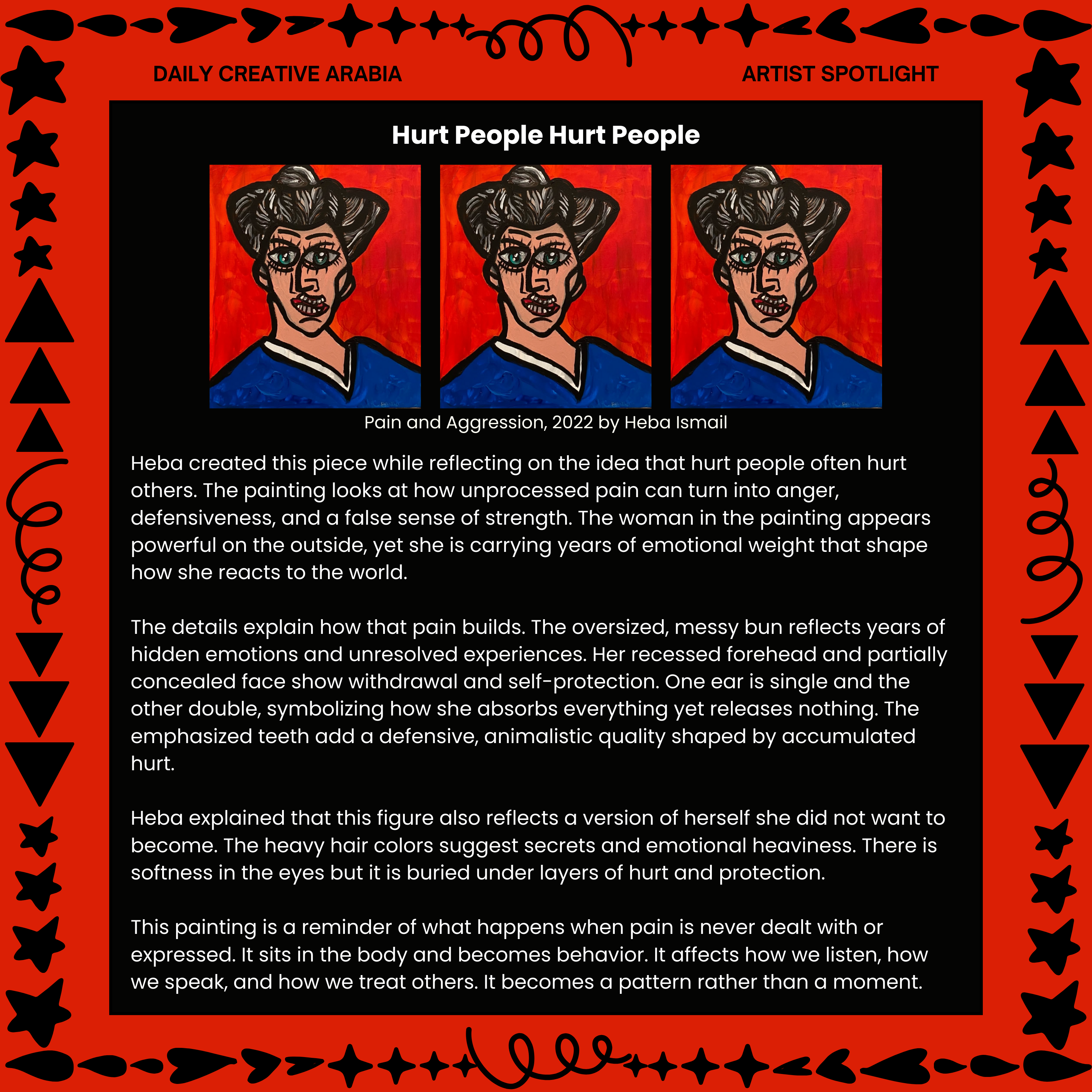 Heba describes her as someone who has turned her pain into armor, whose anger hides deep hurt. Yet she believes there is love in this woman’s eyes, compassion buried under layers of anger and disappointment. She painted this figure as a possible future version of herself, a reminder of who she refuses to become.
