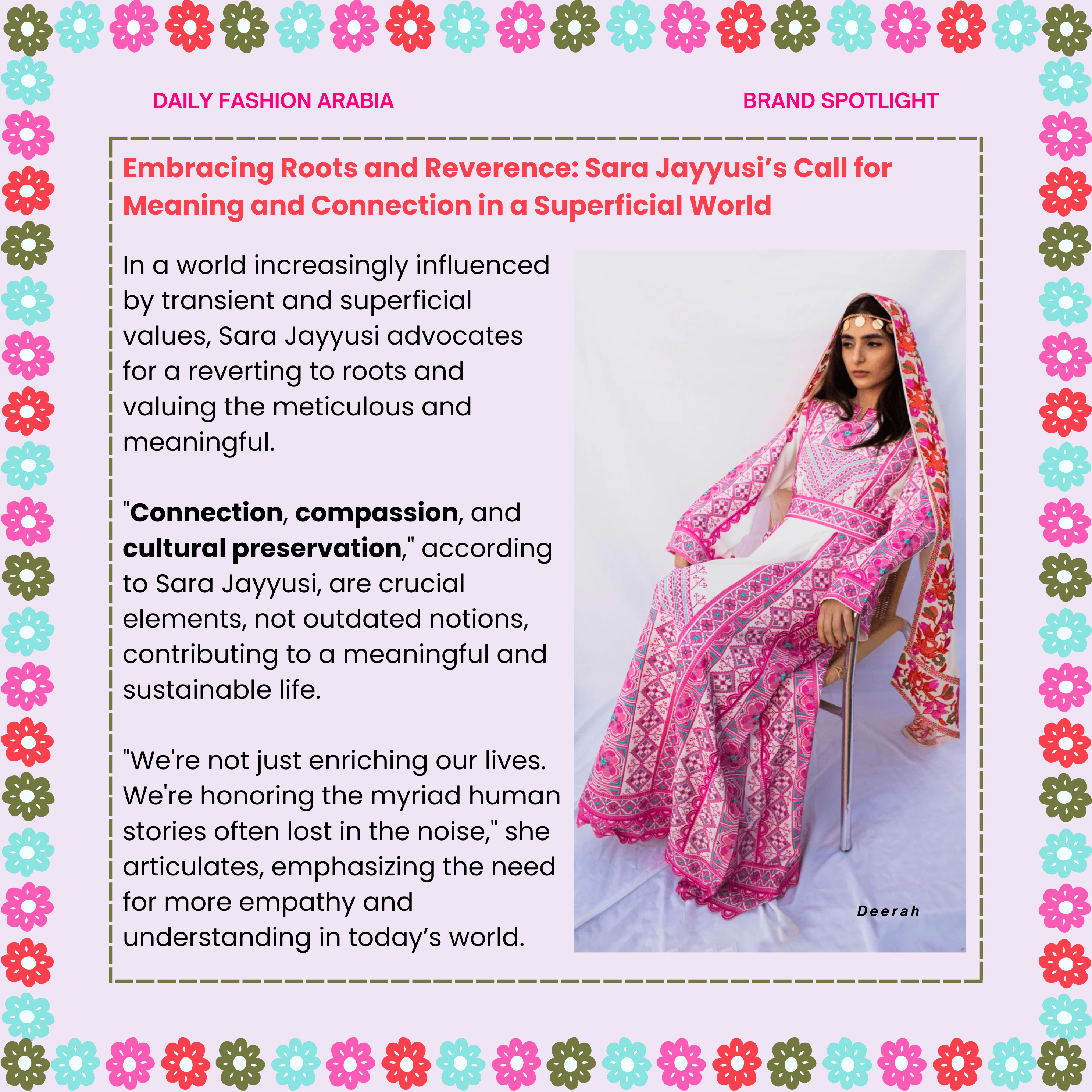 In a world shaped by fast fashion and instant gratification, Sara Jayyusi’s philosophy invites us to slow down. She reminds us that every thread and every stitch holds a story worth understanding.